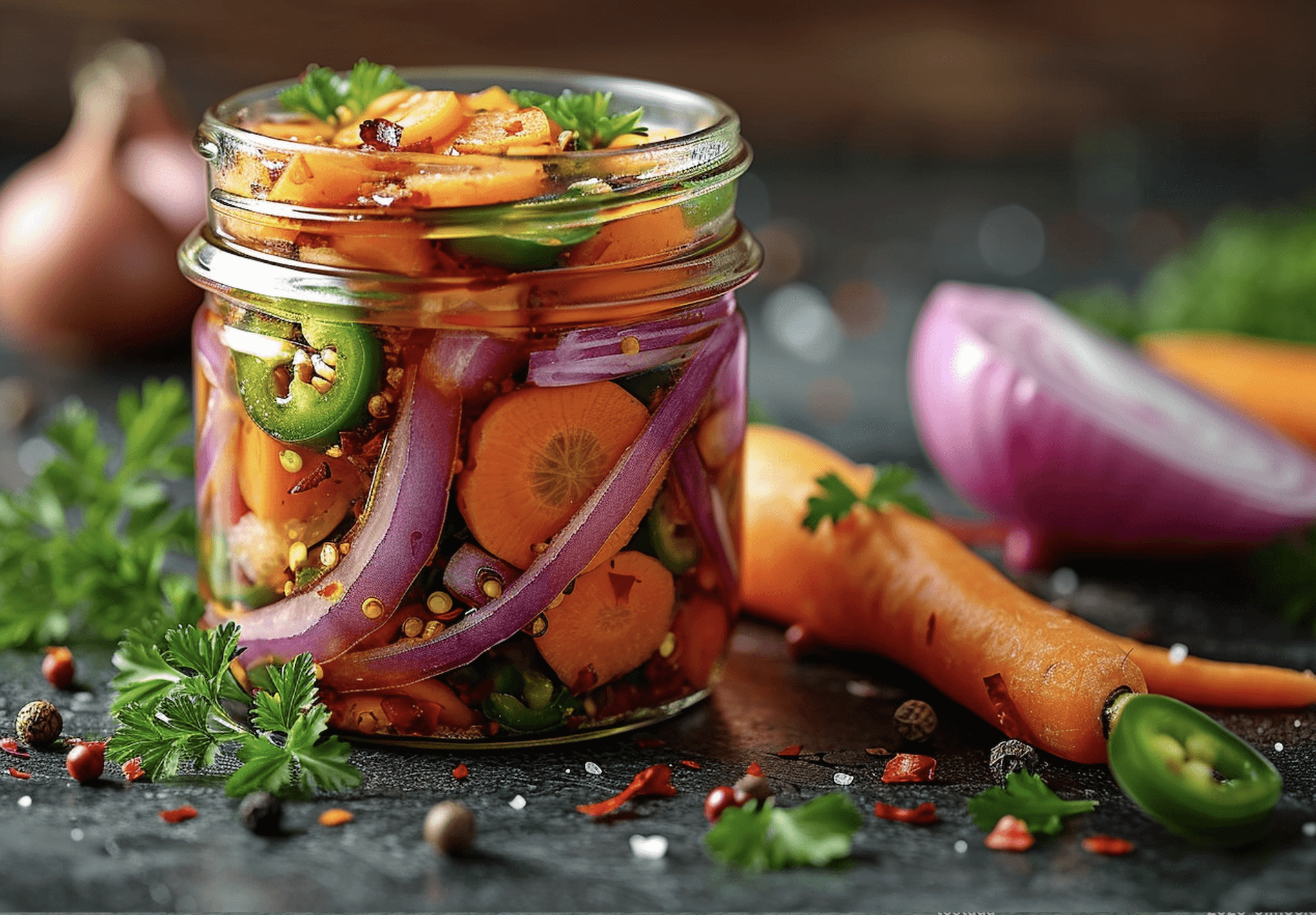 These spicy and tangy pickled vegetables are perfect for topping tacos, serving as a side dish, or snacking on straight from the jar! 🌶🥕🧅